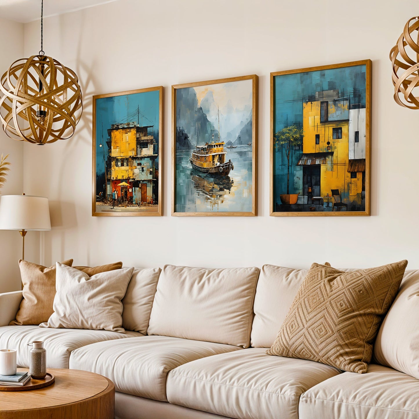 Experience the essence of Vietnam's cultural treasures through our mesmerizing collection of three abstract artworks. Inspired by iconic elements such as the serene fishing boats in Halong Bay, the majestic Saigon Post Office, and the charming Hoi An village, each piece offers a unique interpretation of Vietnam's rich heritage. These artworks are a fusion of artistry and tradition, perfect for those seeking a contemporary yet evocative glimpse into this beautiful country.