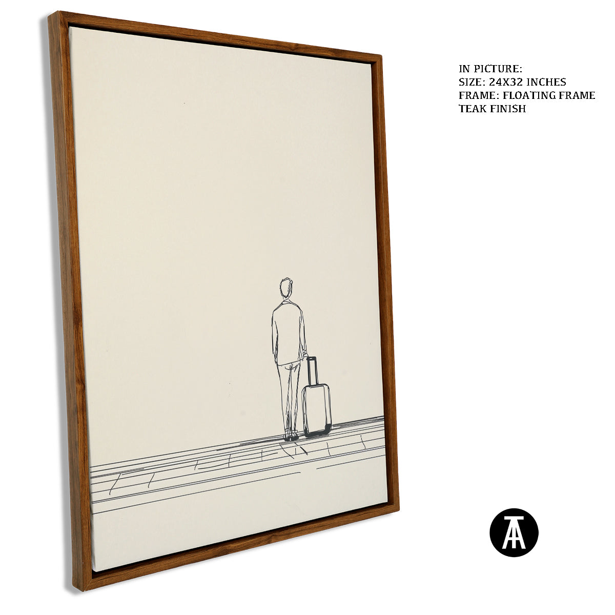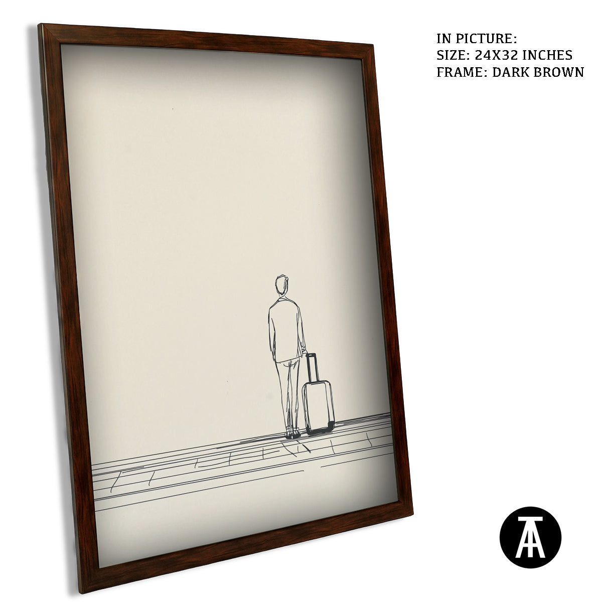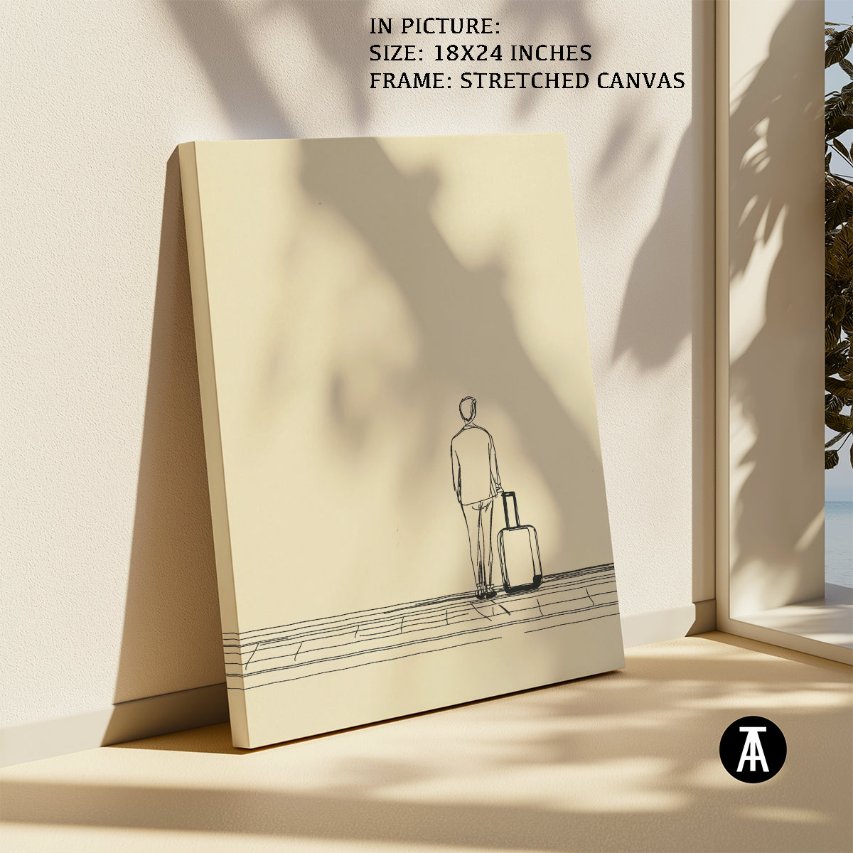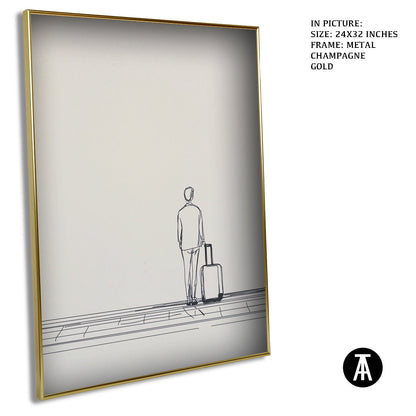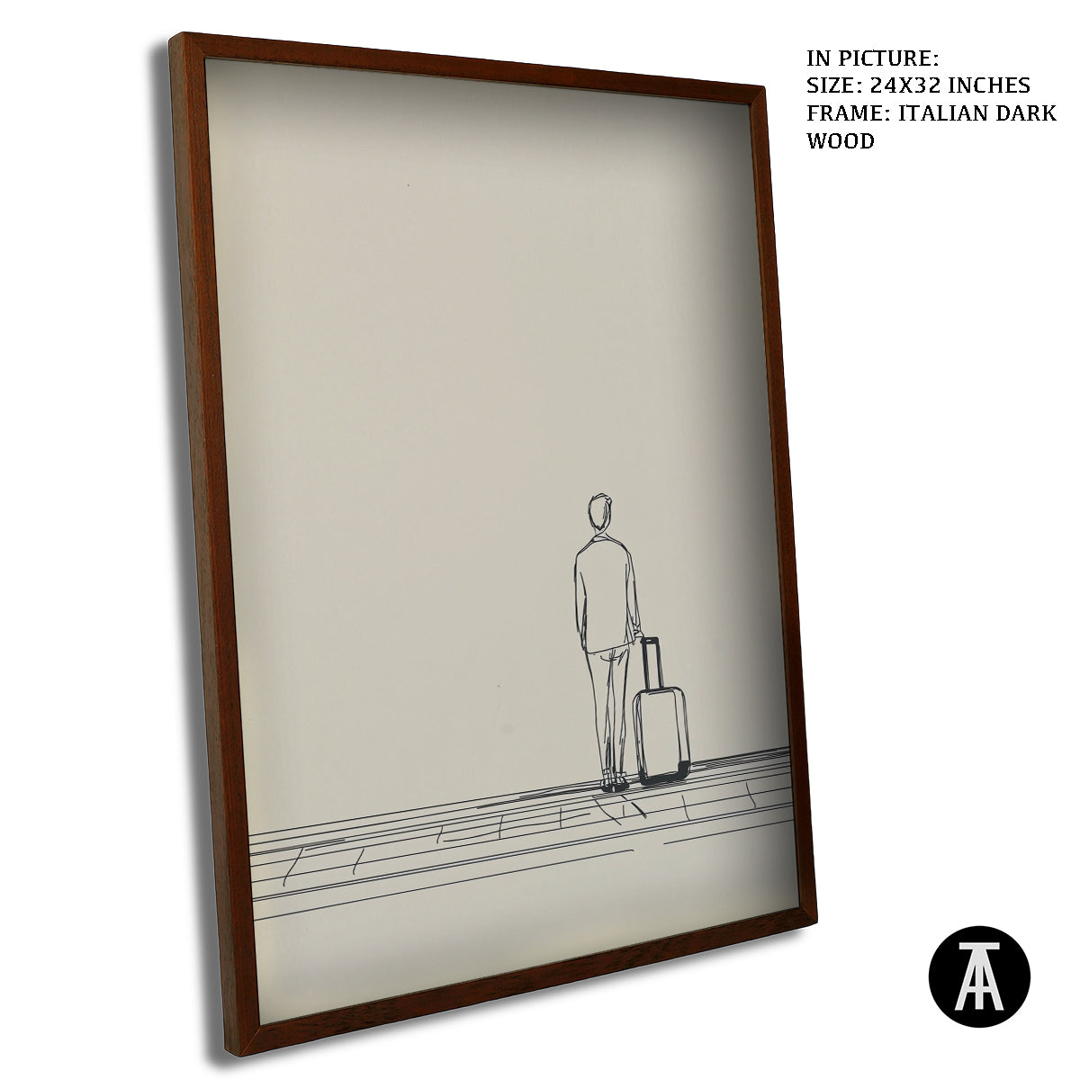 This minimalist piece captures line art of a man waiting at the platform with pure, flowing lines. Emphasizing the beauty of everyday life, it draws from Scandinavian simplicity. It evokes a sense of quiet joy, nostalgia, and mindfulness. Ideal for adding a calming and elegant touch to living rooms, studios, or cozy nooks.